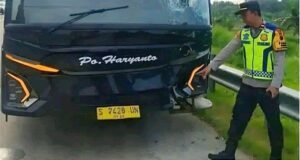KAB. BATANG, JAWA TENGAH – Minggu sore tanggal 15 Maret 2026 yang seharusnya tenang di Tol Trans Jawa berubah menjadi arena derby karambol raksasa di KM 361+600. Namun, drama sebenarnya baru dimulai saat H. Haryanto melihat foto bus bernopol S 7428 UN tersebut. Pak Haji Haryanto langsung mengeluarkan pernyataan klasifikasi tingkat tinggi. Baginya, melihat bus PO Haryanto tanpa gambar Wayang dibodinya itu ibarat melihat Gunung Merapi tanpa asap: Mustahil dan Tidak Sah secara Estetika.
